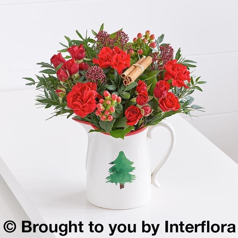Featuring red spray roses, red carnations and red hypericum with pistache, salal, pine, burgundy skimmia and a cinnamon bundle arranged in a Christmas tree ceramic jug.