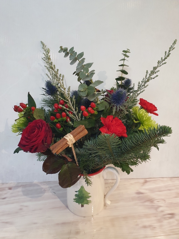 a festive ceramic jug full of beautiful Chrismas foilage including eucalyptus with red roses, carnations, blooms, cinnamon, thistle and hypericum berry